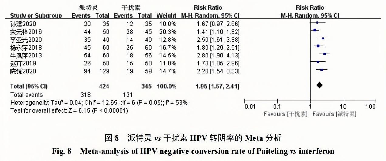 7項研究[21-27]報道了派特靈與干擾素的HPV轉陰率對比,采用隨機效應模型(I2=53%,P=0.05),結果顯示派特靈組HPV轉陰率為75.0%(318/424),干擾素組HPV轉陰率為37.97%(131/345);