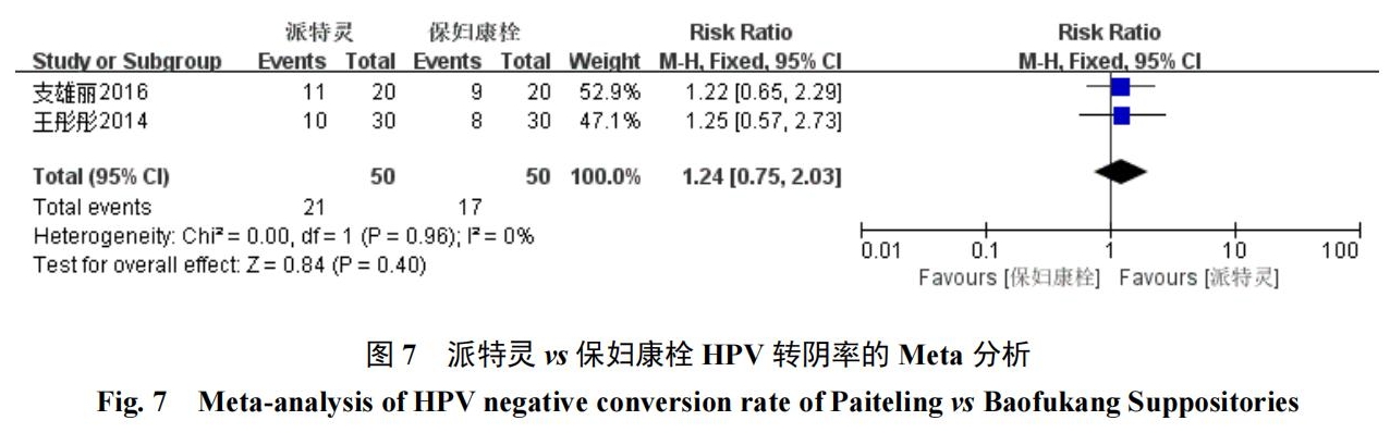 2項研究[19-20]報道了派特靈與保婦康栓的療效對比,采用固定效應模型(I2=0,P=0.96),結果顯示派特靈組HPV轉陰率為42%(21/50),保婦康栓組HPV轉陰率為34%(17/50);