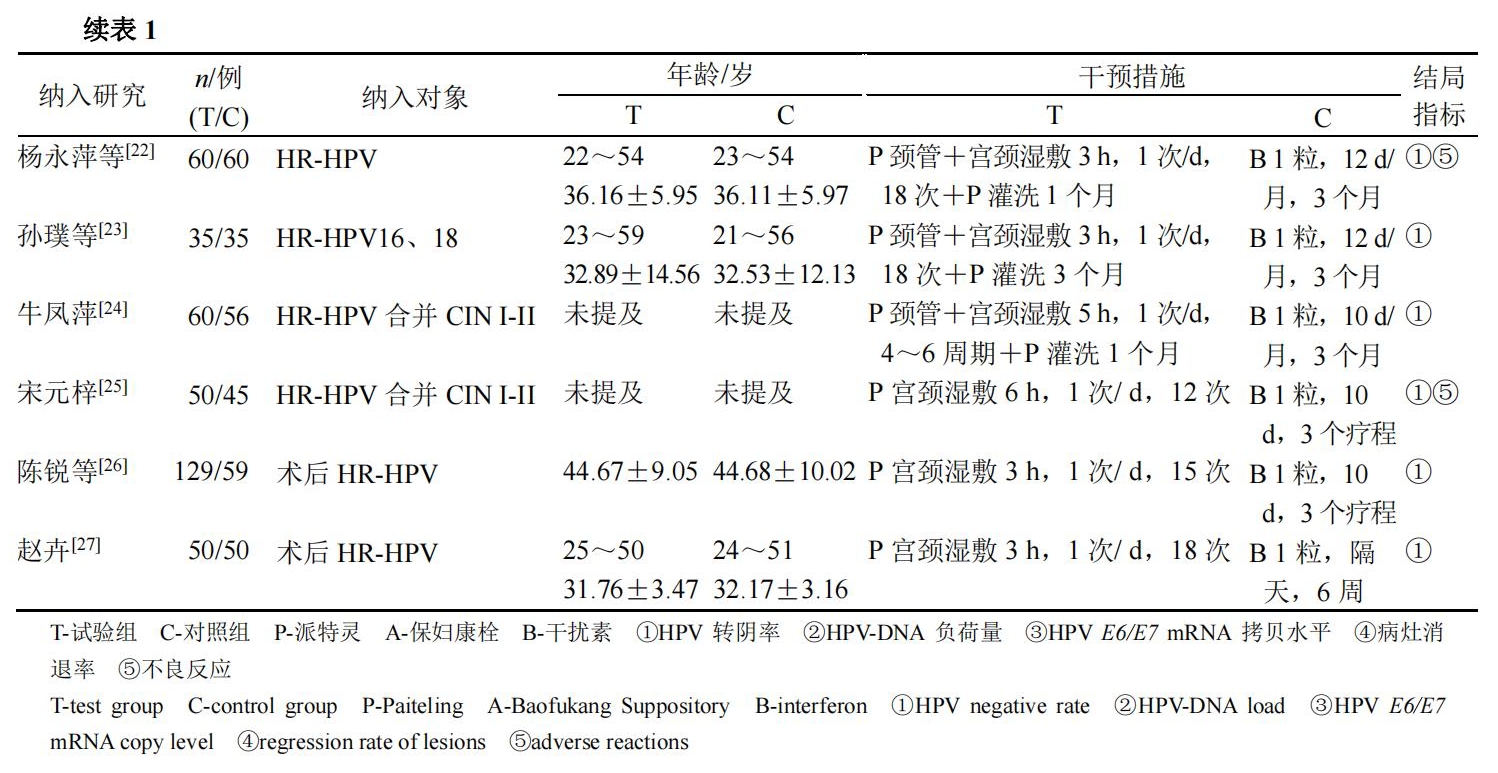近年來(lái)中藥制劑廣泛用于HPV的清除治療?中醫學(xué)中,根據病毒感染后出現的臨床癥狀將其歸屬于“帶下病”范疇,認為HPV感染病機不離“濕邪為患”又有”脾腎虧虛”“濕熱濕毒”從而導致“任脈損傷,帶脈失約”[4]?中藥制劑派特靈中含金銀花?大青葉?鴉膽子?苦參等清熱解毒燥濕及黃芪等扶正驅邪藥物,其優(yōu)點(diǎn)在于能提高細胞免疫,發(fā)揮免疫清除作用,有效清除HPV病毒[5]?運用派特靈治療 HPV 感染的文獻報道證實(shí)其具有一定的療效,但尚缺乏對大樣本數據統計研究進(jìn)行高質(zhì)量的系統評價(jià),本研究對派特靈治療HR-HPV感染的RCT進(jìn)行Meta分析,以期為HR-HPV感染的臨床治療提供循證醫學(xué)證據?