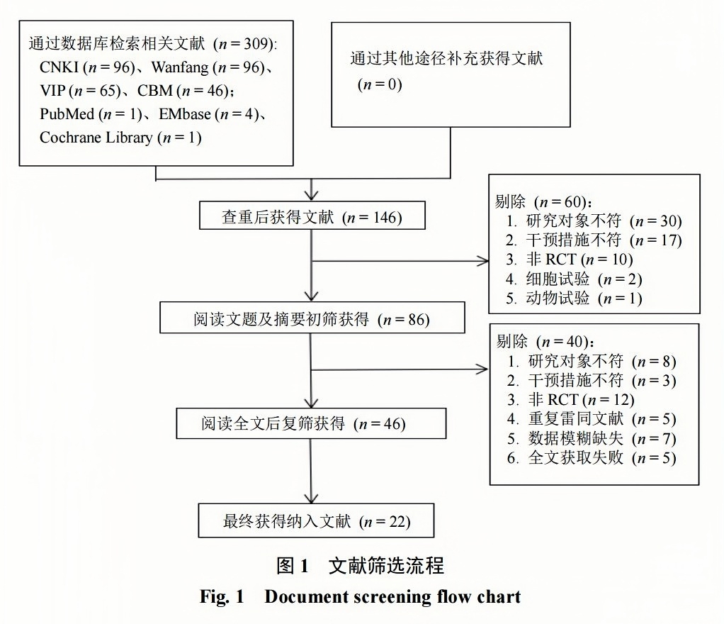 初檢共獲得309篇文獻,其中中文文獻303篇,英文文獻6篇;刪除重復文獻163篇,其中中文文獻162篇,英文文獻1篇;閱讀標題及摘要獲得86篇,進(jìn)一步閱讀全文復篩,最終納入22項RCT[6-27]?文獻篩選流程見(jiàn)圖1?