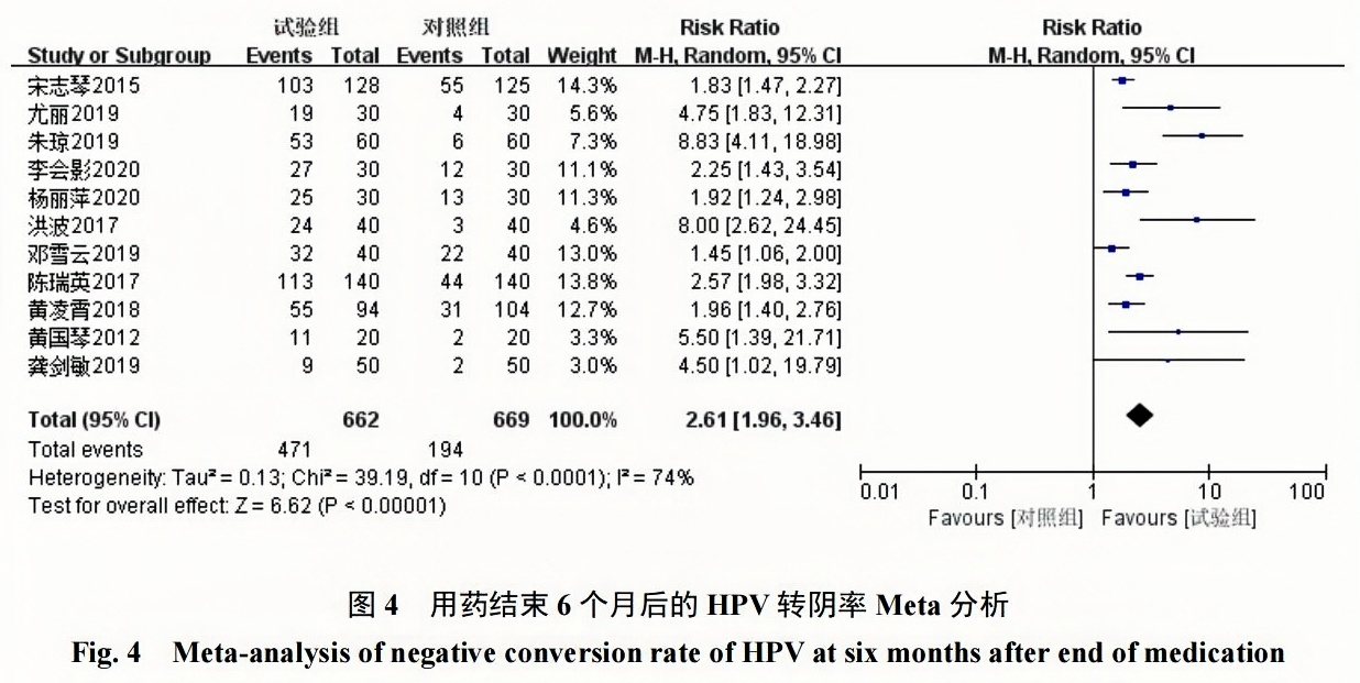 2組HPV轉陰率對比具有統計學(xué)意義 [RR=2.61,95% CI(1.96,3.46),P<0.00001]。見(jiàn)圖 4。