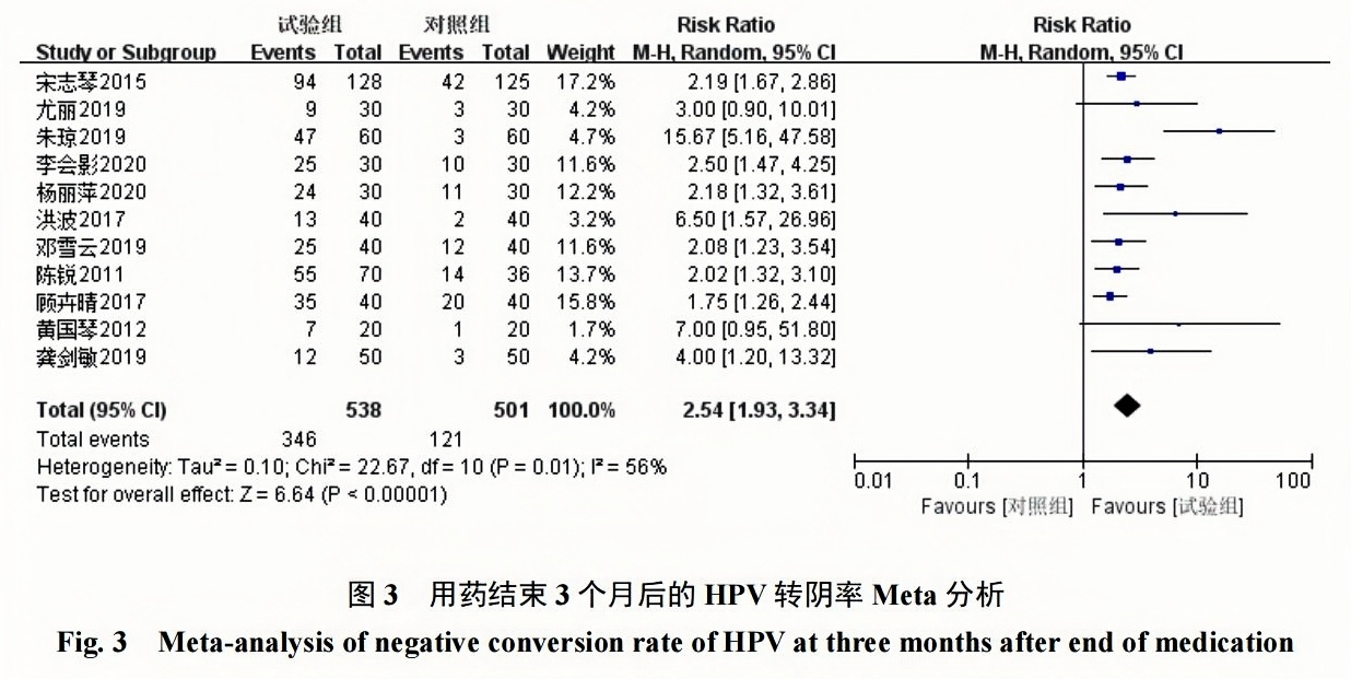11項研究[6-14,17-18]報道了用藥結束3個(gè)月后的HPV轉陰率,采用隨機效應模型(I2=56%,P=0.01),結果顯示派特靈組HPV轉陰率為64.31%(346/538),隨訪(fǎng)對照組HPV轉陰率為24.15%(121/501);