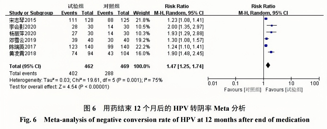 2組HPV轉陰率對比具有統計學(xué)意義[RR=1.47,95%CI(1.25,1.74),P<0.00001]?見(jiàn)圖6?