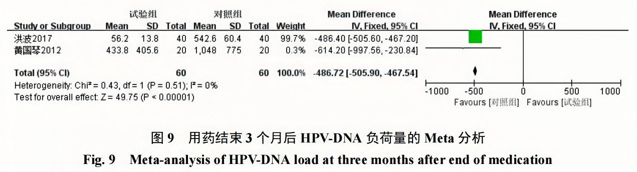 用藥結束3個(gè)月后派特靈組HPV病毒載量明顯低于隨訪(fǎng)對照組,2組臨床療效對比具有統計學(xué)意義[MD=?486.72,95% CI(?505.90,?467.54),P<0.000 01];