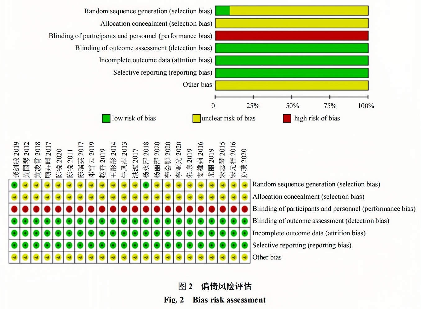 22項研究均未描述分配過(guò)程,無(wú)充足信息判定等級風(fēng)險,均為未知風(fēng)險。
