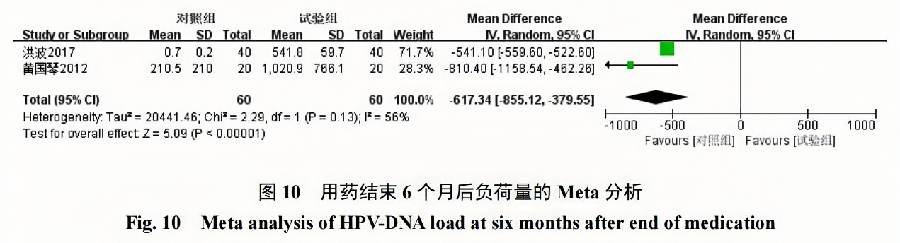 2項研究[17-18]報道了治療結束3個(gè)月及6個(gè)月后派特靈組與隨訪(fǎng)對照組的HPV-DNA負荷量變化,分別采用固定效應模型(I2=0,P=0.51)及隨機效應模型(I2=56%,P=0.13)進(jìn)行Meta分析?