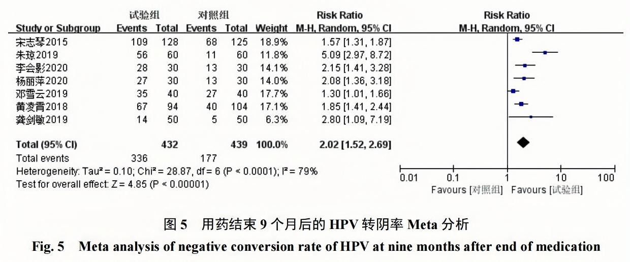 2組HPV轉陰率對比具有統計學(xué)意義[RR=2.02, 95%CI(1.52,2.69),P<0.00001]。見(jiàn)圖5。