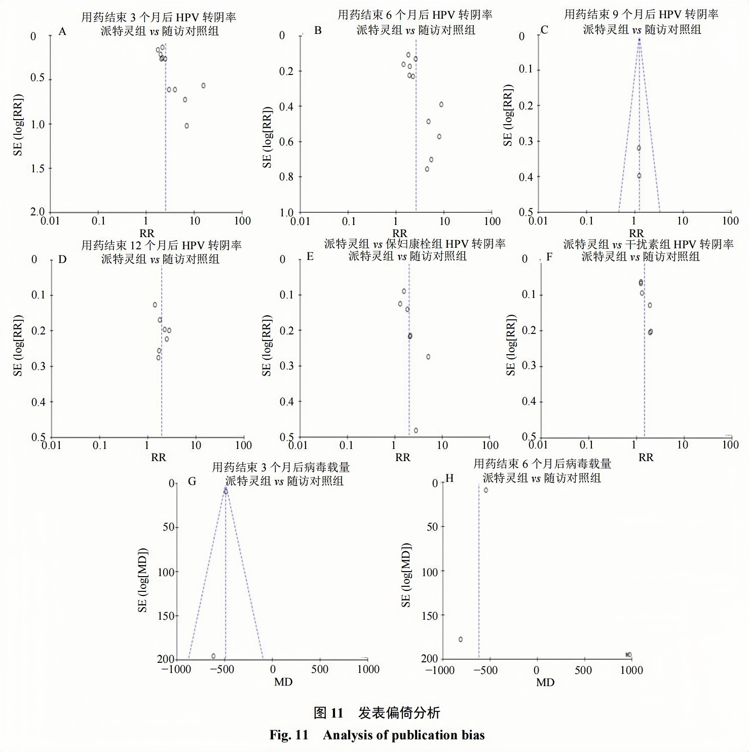 本研究的分組均分別進(jìn)行了發(fā)表偏倚分析,漏斗圖顯示2側分布基本對稱(chēng),提示存在發(fā)表偏倚的可能性較小。見(jiàn)圖11。